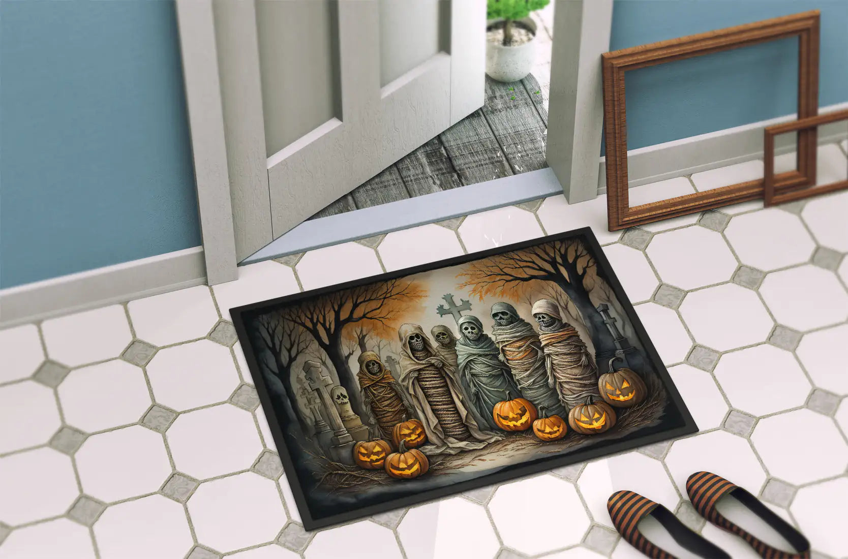 Celebrate Halloween with this Halloween Doormat. Welcome your guests in style with our Artwork Door Mat, designed to withstand almost any weather condition. This mat, measuring approximately 18 by 27 inches, is held together by durable black binding tape. Its top layer, composed of polyester felt, is dyed with the eye-catching image you see on the mat. A few layers below provide the mat with stability, while its rubber bottom is stamped to help prevent slipping and ensures safety. Our mat works wonderfully as both an indoor or outdoor door mat. For cleaning, simply hose it off with water or use a power washer - no need for any cleaner that produces suds. Avoid scrubbing with a brush, instead, opt for the vacuum on floor setting. Designed manufactured and printed in the USA, this mat is a perfect addition to your porch, outdoor kitchen, entryway, or any indoor space. Its unique design makes it a charming decorative rug that greets your guests and adds a stylish touch to your home decor.