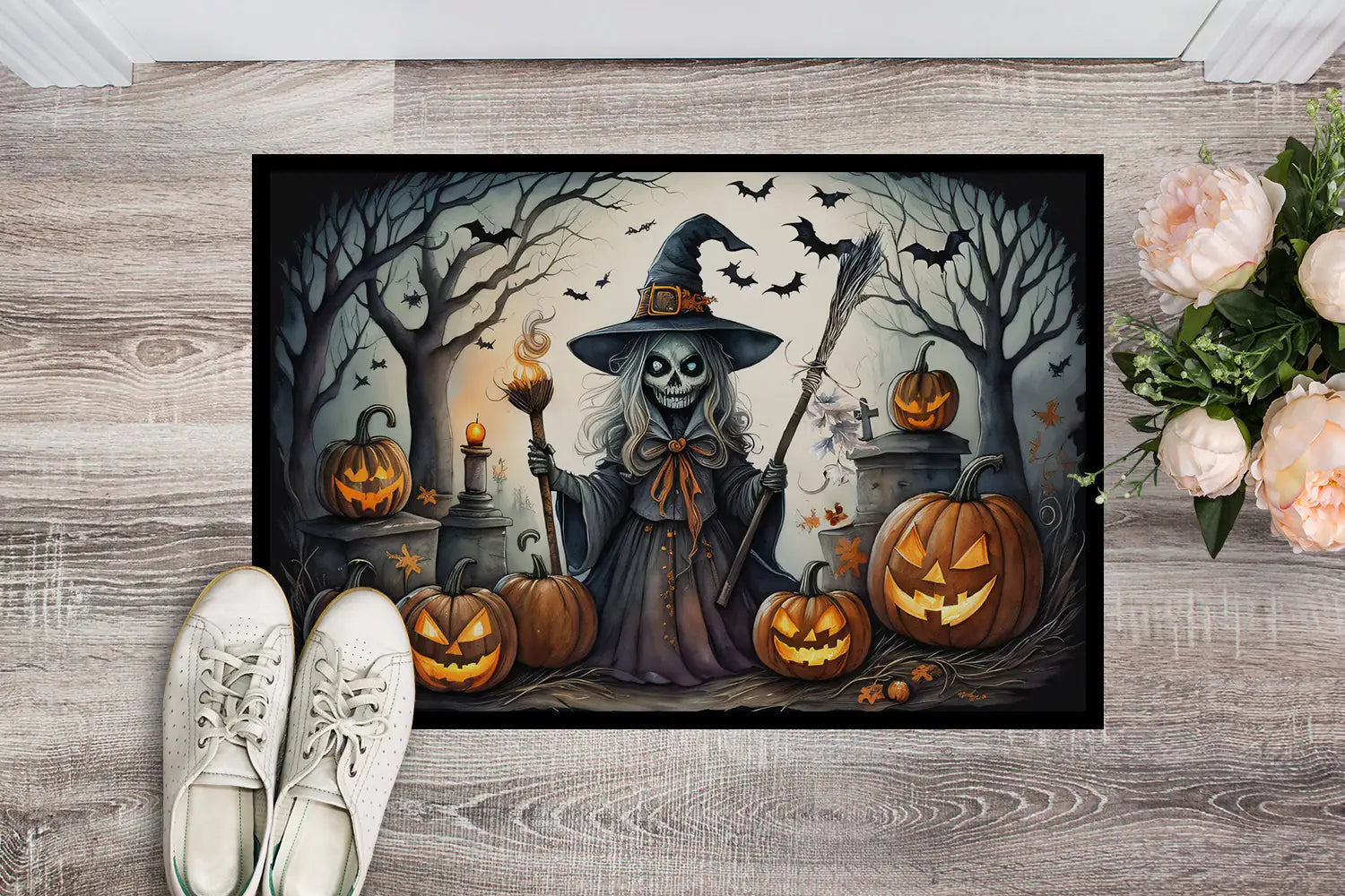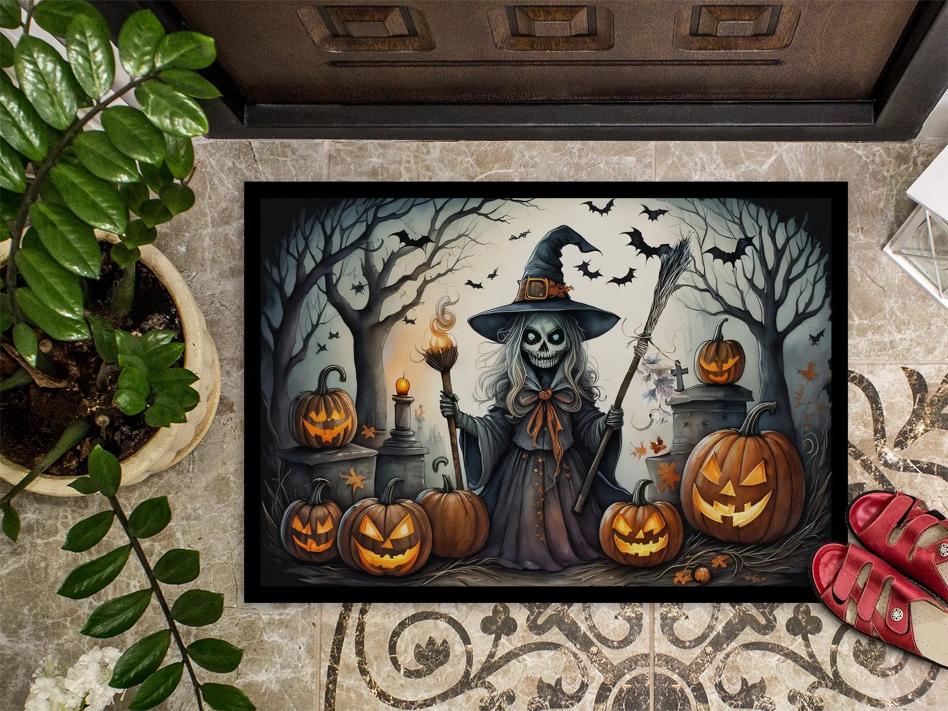 Celebrate Halloween with this Halloween Doormat. Welcome your guests in style with our Artwork Door Mat, designed to withstand almost any weather condition. This mat, measuring approximately 18 by 27 inches, is held together by durable black binding tape. Its top layer, composed of polyester felt, is dyed with the eye-catching image you see on the mat. A few layers below provide the mat with stability, while its rubber bottom is stamped to help prevent slipping and ensures safety. Our mat works wonderfully as both an indoor or outdoor door mat. For cleaning, simply hose it off with water or use a power washer - no need for any cleaner that produces suds. Avoid scrubbing with a brush, instead, opt for the vacuum on floor setting. Designed manufactured and printed in the USA, this mat is a perfect addition to your porch, outdoor kitchen, entryway, or any indoor space. Its unique design makes it a charming decorative rug that greets your guests and adds a stylish touch to your home decor.